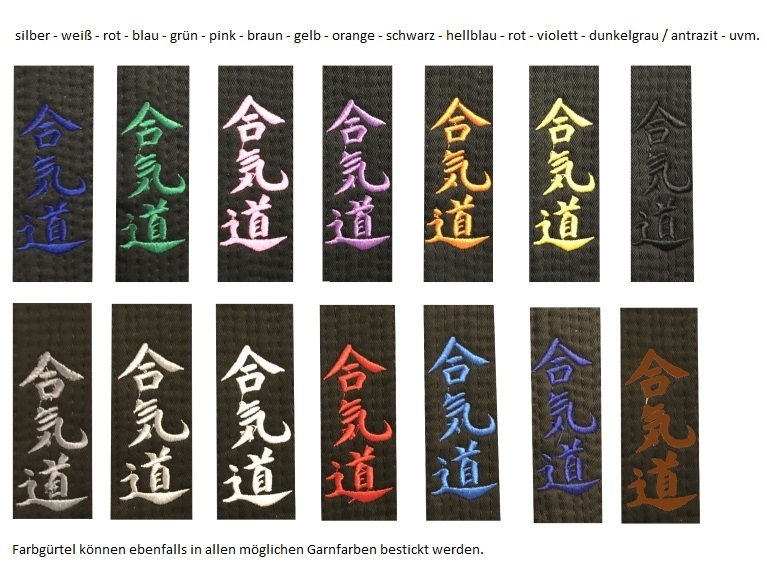 Auch bei den Stickfarben stehen eine Vielzahl an Möglichkeiten zur Auswahl. In der Regel können Gürtel in jeder Garnfarbe bestickt werden. Die Standard-Stickfarbe bei schwarzen Gürteln ist gold.